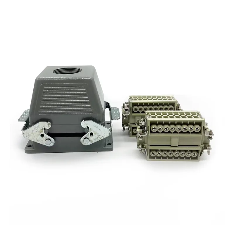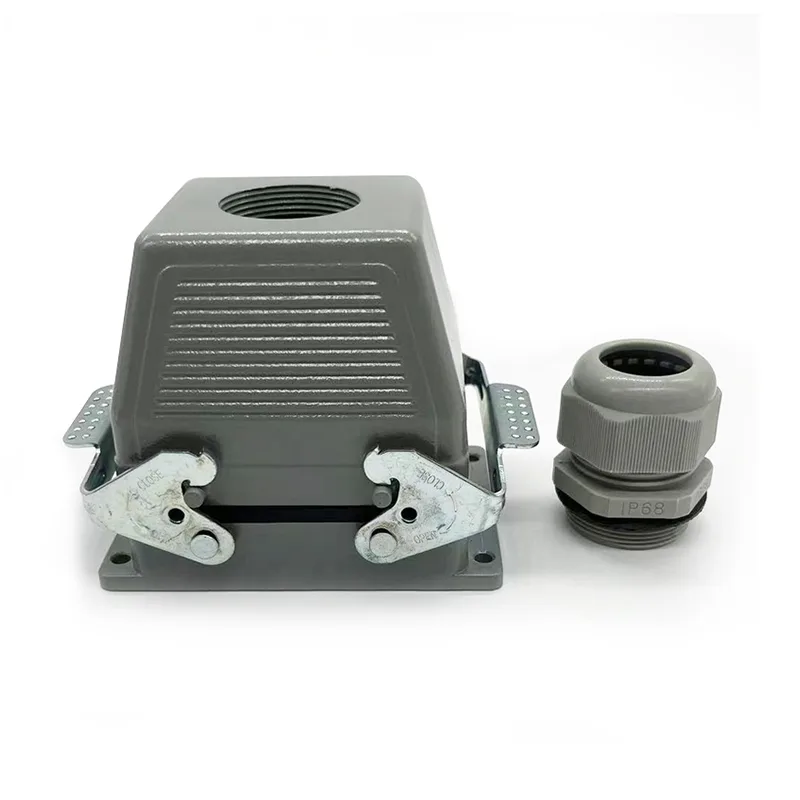 A 32 tűs TG Heavy Duty Connectors apa felső házrész. Apa betétrészekkel vagy anya betétrészekkel kell dolgozni. Általában két darab HE-016-M-mel rögzítik, de néhány speciális ügyfél kéri, hogy két darab HE-016-F-el szereljék össze. Ez egyben a HSB-016 háza is. Az IP65 vízálló tulajdonsága kültéren is használható. A 32 tűs TG Heavy Duty csatlakozók a PG29-hez illeszkednek. Ha az ügyfeleknek eltérő tömszelencék méretű kéréseik vannak, tudjuk elfogadni és megrendelni a gyártást.