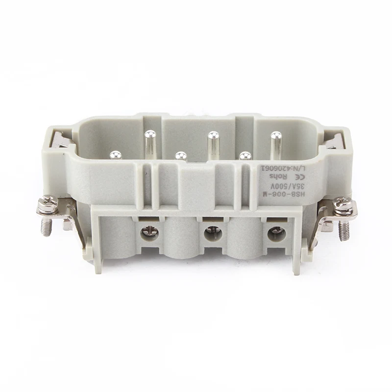 HSB-006-M A HSB nagy teljesítményű csatlakozók 35A áram alatt működnek. .35A 6 tűs betétes nagy igénybevételű csatlakozó 6 tűs vagy dupla 12 tűs a vezetékekkel való érintkezéshez. Különböző munkakörülményekhez kínálja, és népszerű az automata iparban és a gépek vezetékezési típusaiban.